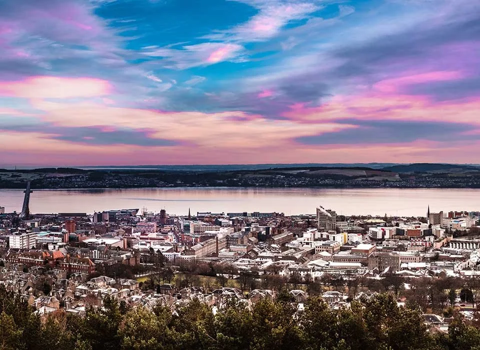 A cityscape with a river in the background under a vibrant sky with pink and blue clouds.